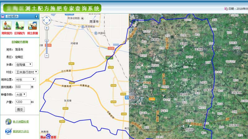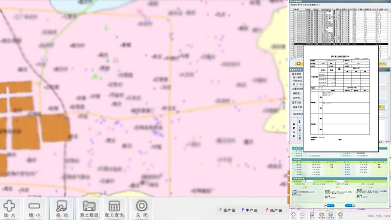 4.电子地图查询:通过电子地图,可以直观的将区域内各测试点分布情况和测试数值情况进行图形标注,可以对电子地图进行无限级别的放大、缩小、测距、测面积等操作,并通过电子地图可以检索符合条件的测试点,可进行数据查看、配方建议卡查看和模糊配方的开具。并可通过电子地图查看土壤图、土地利用现状图和其他相关图示等。