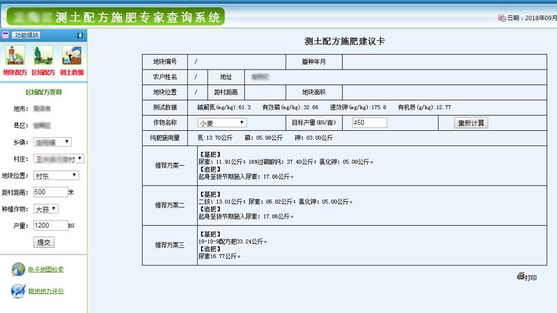 测土配方施肥专家系统(农作物施肥信息系统)是快速建立各区域内土壤地力基本情况、种植作物施肥信息、施肥建议方案和施肥指导的专用平台。以农户调查资料、田间试验数据、土壤测试结果、肥料信息为基础,结合当地的施肥习惯和专家经验进行不同种植作物在某个地块或区域内的施肥建议方案的开具。并且可以将土壤测试得来的数据在电子地图上进行标注,可以按照不同的数据分析条件在电子地图上显示不同的标注结果,在电子地图上进行测试数据及地块配方的查看,并可进行区域性配方开具。系统开具的测土配方施肥建议卡可实现综合检索批量打印,实现快速、集中开具施肥方案建议。