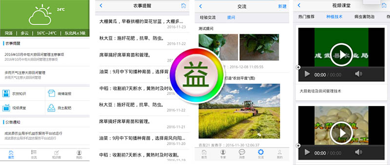 益农服务手机APP通过智能手机端实现:农事信息提醒、农业技术交流、种养植咨询、视频微课堂、农技知识库等功能。是农业从业人员与农业专业技术人员之间通过新媒介进行互动交流的渠道,是农业从业人员工作的小助手。